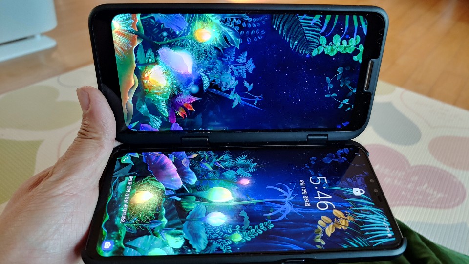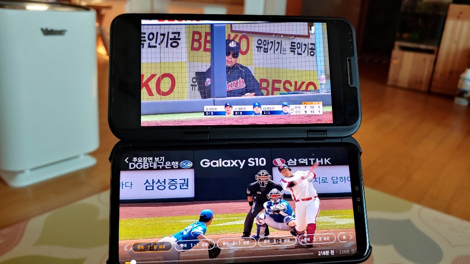 자 이것이 바로 이번 V50 패키지의 야심만만한 화제작 듀얼 스크린입니다. 비닐포장지에 탈착하는 방법이 직관적으로 잘 설명되어 있어 쉽게 결합하고 해제를 했습니다. 정말 뽀대 작살~~~ 저는 야구를 좋아라해서 연결하자마자 야구를 봤는데 멀티태스킹 작업에 노드가 걸리는게 하나도 없어서 감동극장이였습니다.