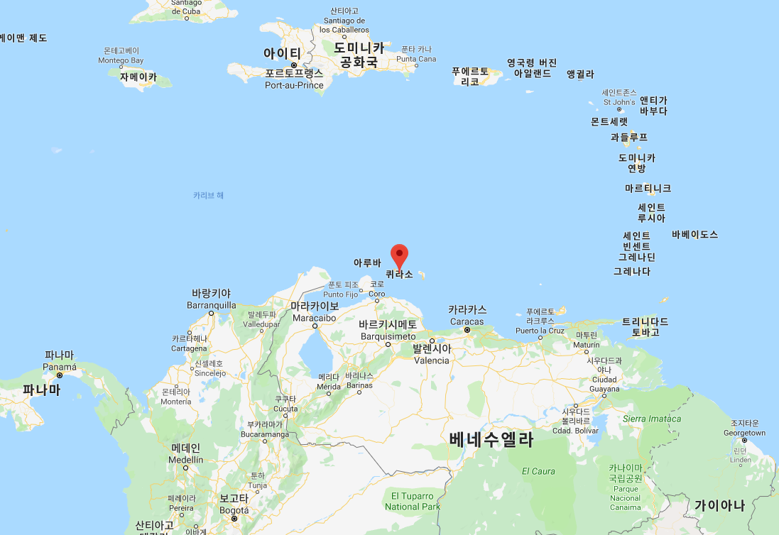 퀴라소는 베네수엘라에서 북쪽으로 약 60km 떨어진 카리브 해에 있는 네덜란드의 자치령으로 퀴라소의 면적은 448km² 인구는 160,000명입니다.