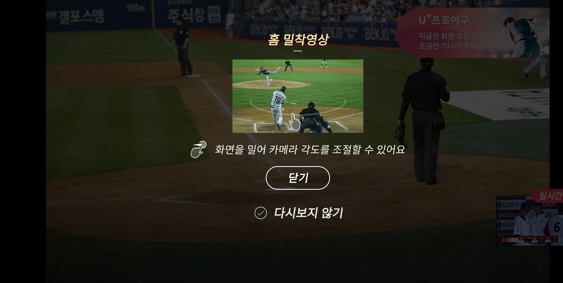 TV중계에서는 볼 수 없는 U+독점 중계 영상으로 직관처럼 생생한 경기 장면을 즐길 수 있습니다.