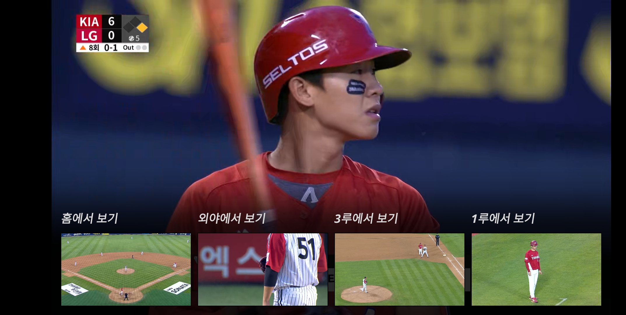 먼저 TV에서 많이 보셨을텐데요 크게 경기장 줌인과 홈 밀착영상 그리고 원하는 야구장 위치에서 포지션별로 볼수 있는 포지션별 영상이 크게 인상에 남았습니다.
