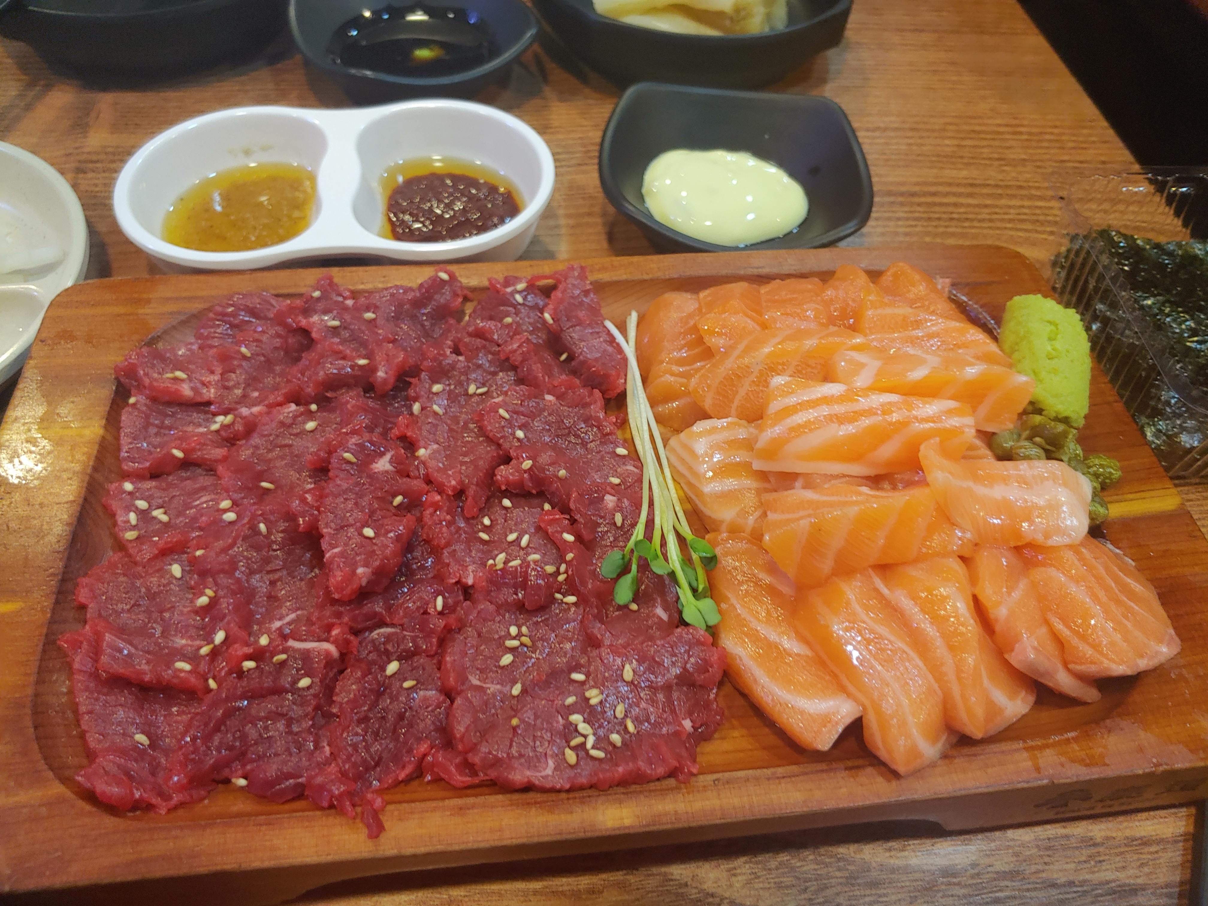우리는 서로 좋아하는건 반반인 육반연반 그러니까 육사시미반 생연어반하는 중자를 시켰습니다.