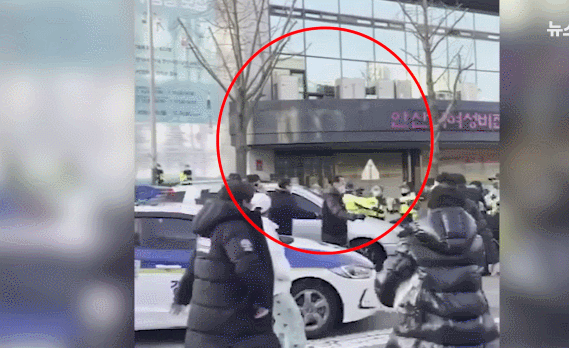 결국의 우리의 명승사자 명한만은 모든 수비를 뚫고 뛰어가 조두순의 낭심은 아니지만 호송하는 운전석을 강하게 차버렸습니다. 하지만 그게 전부였고 외마디 항의만한채 여러명의 경찰관에 둘려쌓여서 쫓겨나고 말았습니다. 명현만은 계속 뭐라뭐라 소리를 지르는데 제가 볼땐 디딤발부터 뭔가 어정쩡하게 뛰어와 좀 초라하게 한 느낌이였어요~