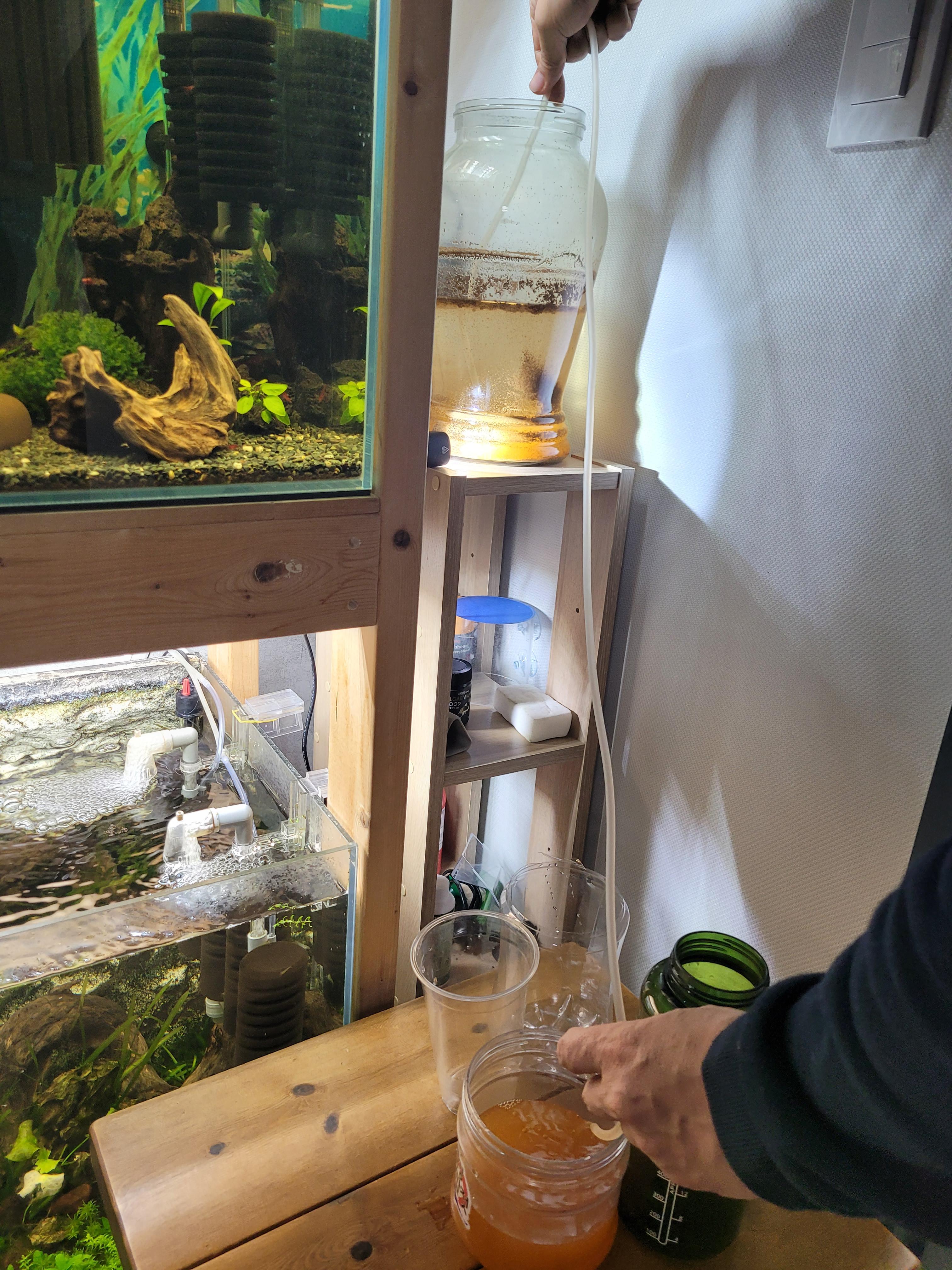 아~ 저는 첫번째는 하단부분에 모여있는 브라인쉬림프를 받는 용도와 중간 층에 상층에 있는 브라인들을 받기 위해 4개 정도의 용기로 나눠 받았습니다. 아직 브라인이 너무 아까운지라 이렇게 구챦게 다 받는데 보통 찐하게만받고 나머지는 다버리더라고요~ 아깝게