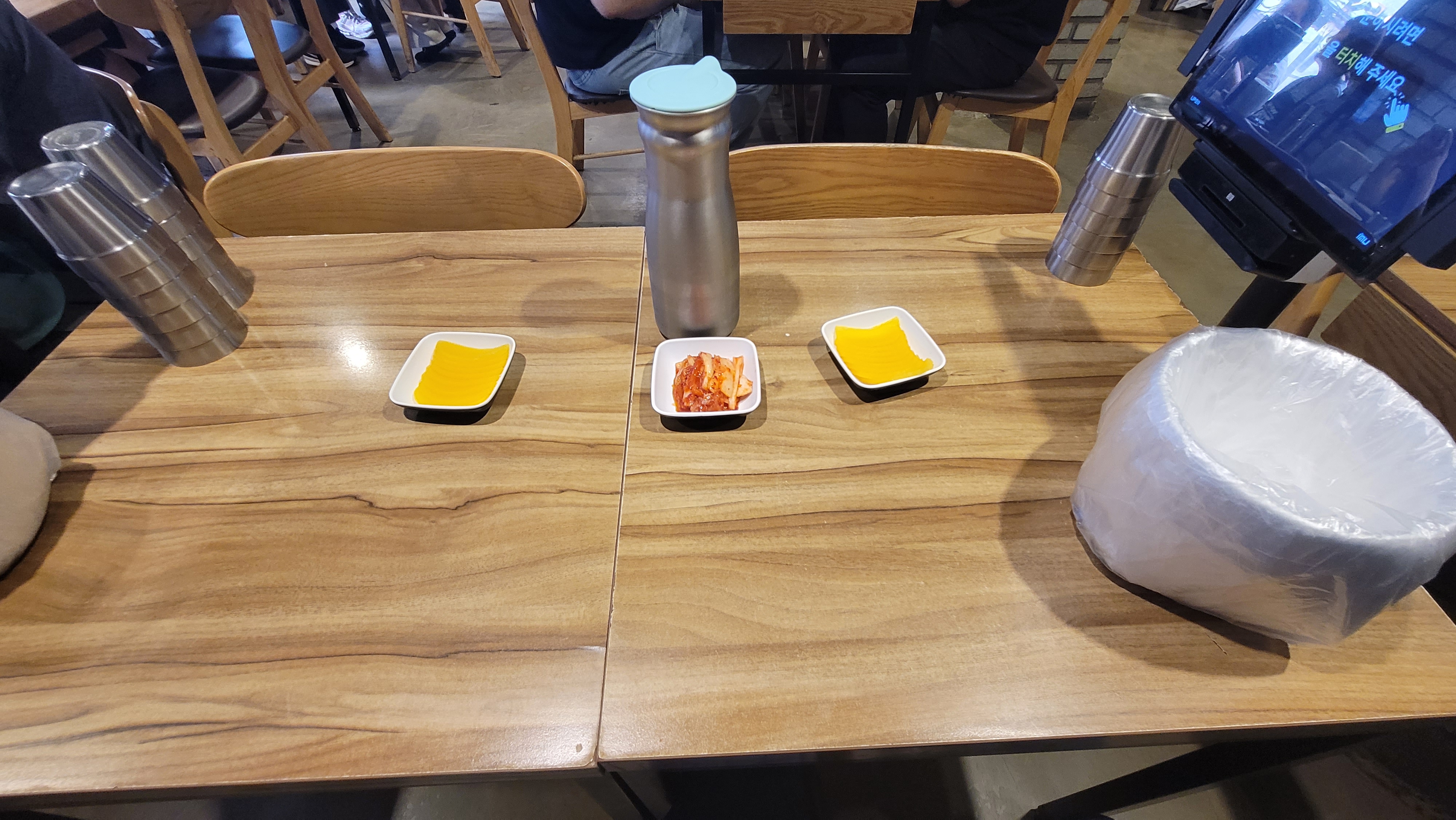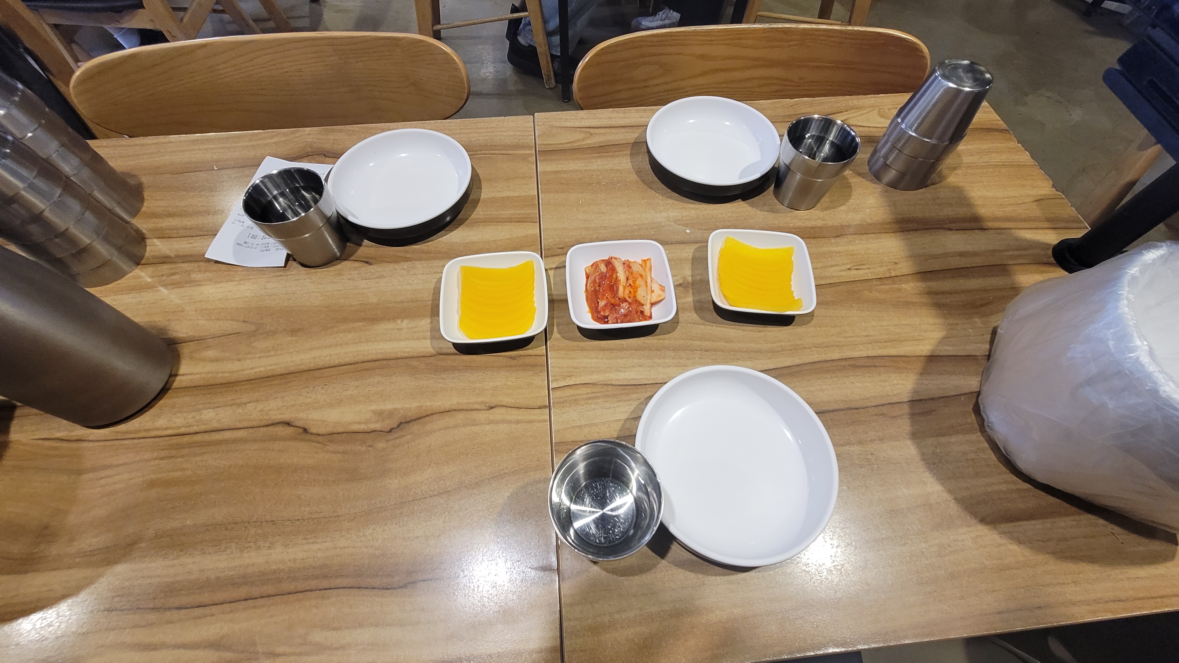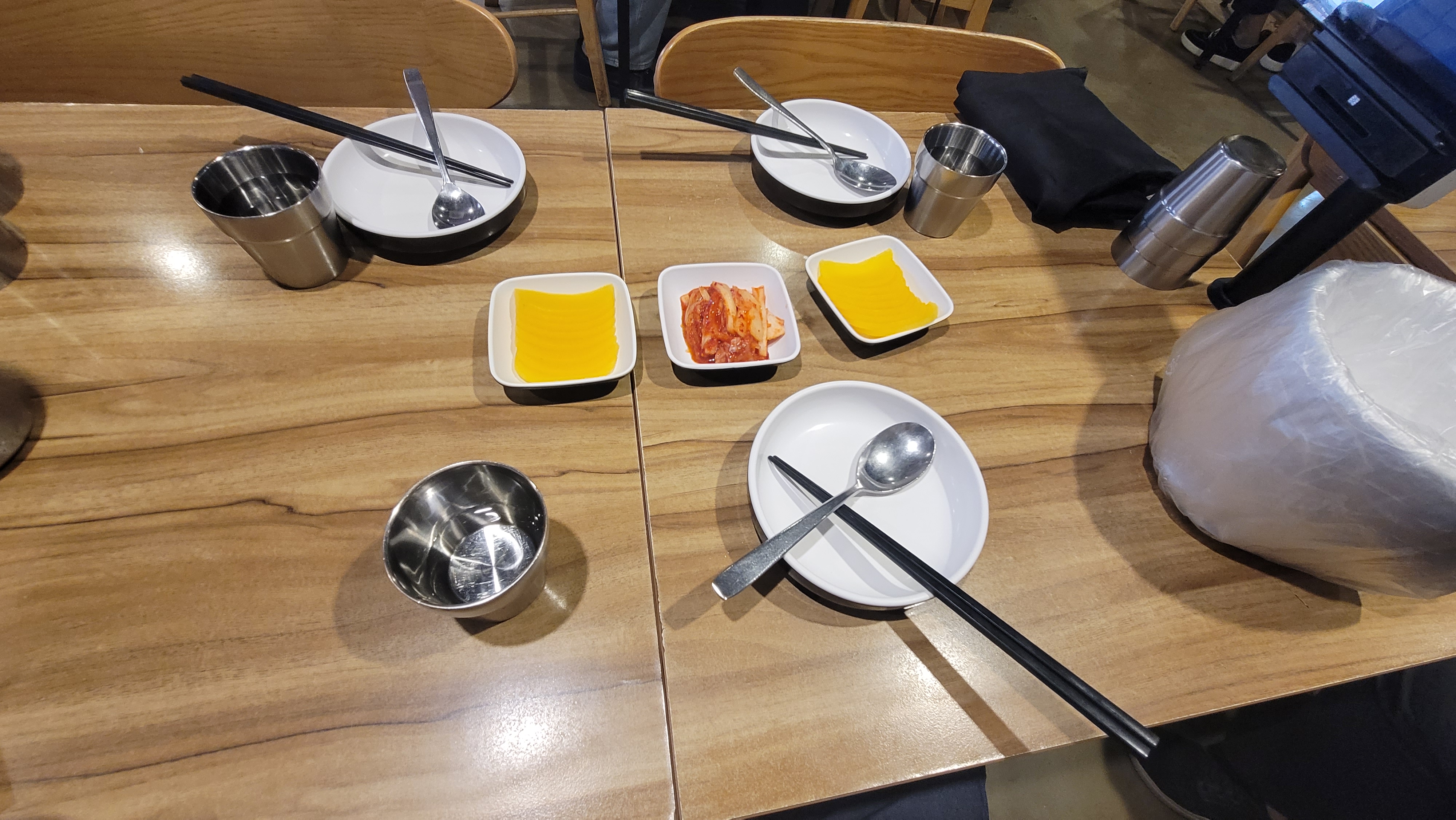 뿌듯해서 앞접시 하나씩 놓고 물도 한잔씩 채우고 테이블 또 찍어봅니다.