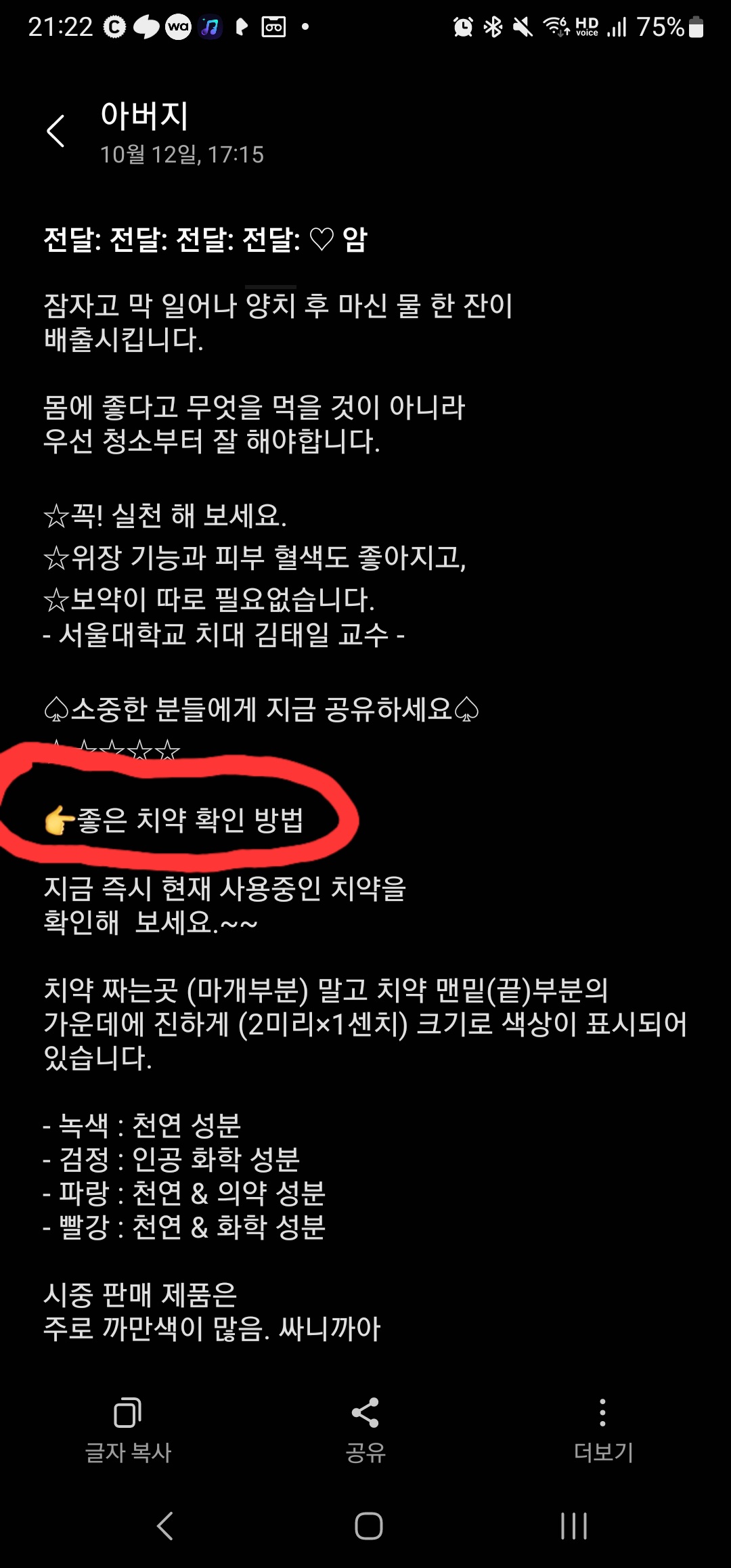 예전에 아버지에게 온 건강 문자가 하나 있습니다. 워낙에 건강에 관심이 많으셔서 좋은 정보다 싶은것은 그대로 따라하시고 주위에도 공유를 하셨는데 오늘 그 건강문자 중 녹색치약이 천연이고 검정색인 화학제품이고 뭐 이런 엄청난 루머에 대해 파헤쳐 보는 시간을 가질까 합니다. 일단 핫슈 믿고 따라와보시죠~